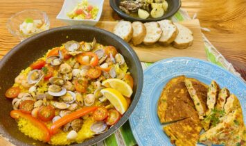 テーマは《お手軽スペイン料理》🍴バター香るシーフードパエリア🍴新じゃが芋とオイルサーディンのアヒージョ🍴コールスローサラダ🍴スペイン風オムレツ🍴白桃と紅茶のゼリーフライパンひとつで作ること…